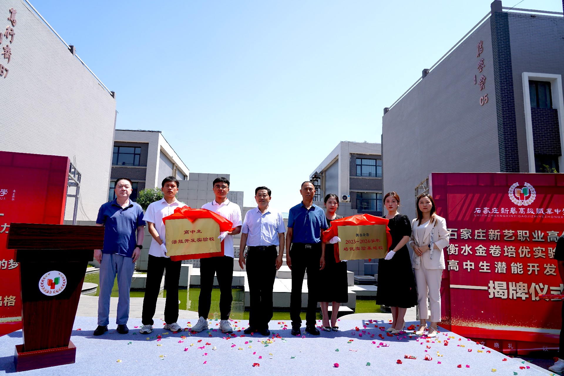 2023年6月27日上午,“衡水金卷培優(yōu)實驗基地校”、“高中潛能開發(fā)實驗?!苯遗苾x式在石家莊新藝職業(yè)**中學舉行。出席本次揭牌儀式的有:石家莊新藝職業(yè)**中學董事長、校長周廣勝,河北金卷教育科技有限公司黨支部書記高萬民,高中生潛能課題組教育發(fā)展培訓中心主任王雪嬌等。